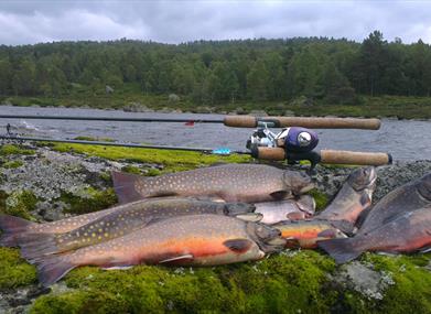 I Lauvatnet kan du fiske langs bredden, fra brygga eller la deg drive lett over vannet i båten. Fjellørret fra krystallklare vann eller bekkerøye fra vassdraget med kjøtt farget som aprikos er elsket av de fleste som har kastet med sluk eller flue.