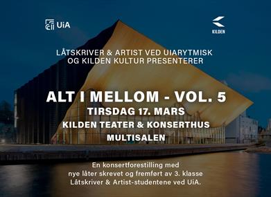 Studentene fra 2. klasse låtskriver/artist ved UiArytmisk har gleden av å presentere «Alt i mellom – Vol. 5». En konsert hvor de ønsker å invitere publikum inn til sine egne låtskriververdener. Låtskriver og artistene skal reflektere, fortelle, tolke og sette egne ord til sin musikk. Låtskriverne og artistene i 2. klasse gleder seg til å entre scenen på Kilden teater og konserthus for første gang med sitt nyeste prosjekt.