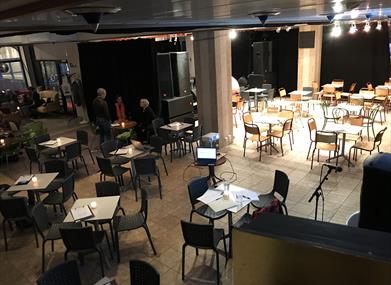 Bankgården i Arendal har konsertscene og arrangementslokale for opptil 480 personer. Kan bookes til konferanse, selskap og andre typer arrangement. Smag & Behag besørger mat/drikke.