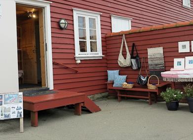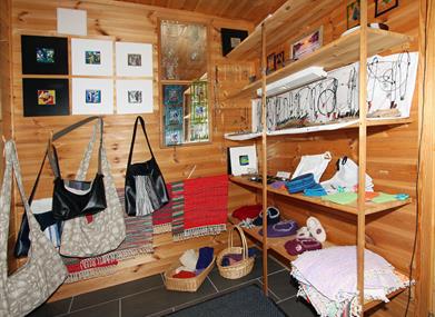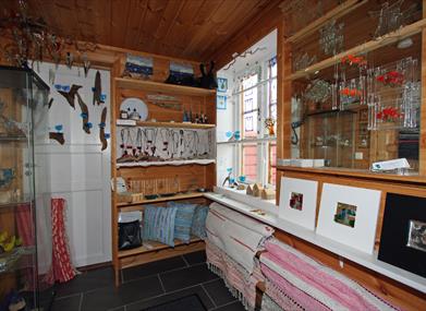 Egenprodusert håndtverk -glassmykker, bilder, tepper, gummivesker, filleryer, tovede tøfler/votter m.m.