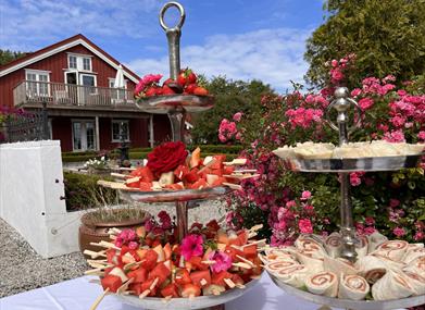Vi har en hyggelig liten kafe hvor det serveres gårdens egne kaker og lunsjretter. Ønsker du kun å besøke vår kafe er det selvsagt mulig, men ved besøk i hagen må du betale inngangsbillett. NB! Vi har en gunstig pris for sesongkort. Vi har både inne- og uteservering hvor du kan kose deg med noe godt fra oss. Kafeen er åpen for publikum onsdag til fredag kl 12-18 fra 25. juni til og med 8. august.