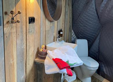 Håndklær, badekåpe og tøfler er klar til deg, det samme er et sett med vår eksklusive ansikts mist og serum. De fleste domene har innlagt vannklosett og vask med kaldt vann. Varm dusj finner du ved glass restauranten. Ellers er sauna og et bad i elven noe de fleste av våre gjester benytter seg av.