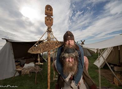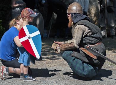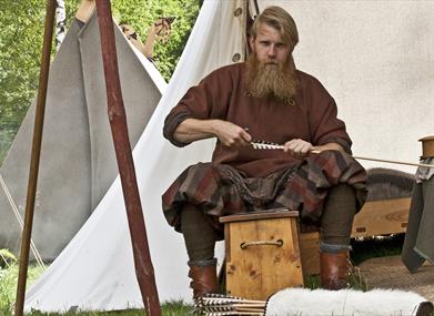 Gorm forteller historier ved bålet, vi får se Osebergteltet og danslabyrinten. Du kan teste bueskytning og ta en padletur i en stokkebåt.