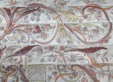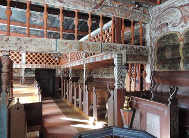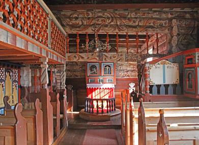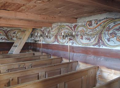 Noko av det som gjer kyrkja så sermerkt, er rosemålinga frå 1826. Dei vakre tømmerveggane har kvit botnfarge, og oppå der breier roser og ranker seg ut. Taket er dekorert som ein himmel med stjerner og skyer. Frå denne himmelen ser Kristus ned på kyrkjelyden, og med løfta hender lyser han si velsigning. Det var Aslak A. Vasshus frå Rauland som stod bak målinga, og med seg hadde han Knut Åvoldsson Byklum frå Bykle. Det er avdekka spor av eldre dekorasjonar som kan vere opphavlege, blant anna grøn rankedekor i koret og ein konge på korplanken. Framsida av galleria er dekorert med utskorne Olavsroser. Dei er knytte til Olav den heilage.
