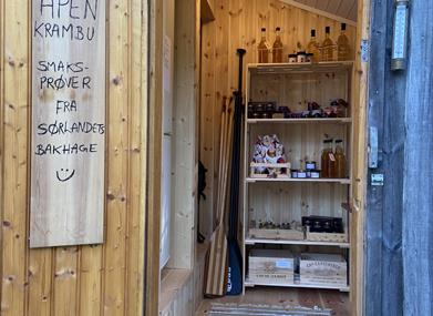 egen terrasse ved lavvoen. Vi har en liten gårdsbutikk, Krambua, der du kan handle ulike