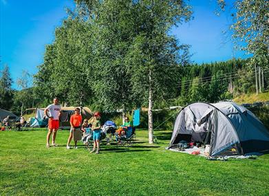 I tillegg finnes plasser for bobil og campingvogn, samt teltplasser langs elvebredden – perfekt for familier og naturelskere.