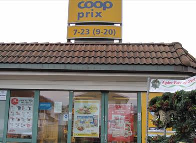 Matvarebutikk i Vigeland sentrum, Lindesnes kommune.Coop Prix Lindesnes har også Post i Butikk.
