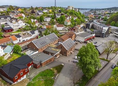 Det er 900m ned til Arendal sentrum, dvs det tar cirka 10 minutter å gå.
