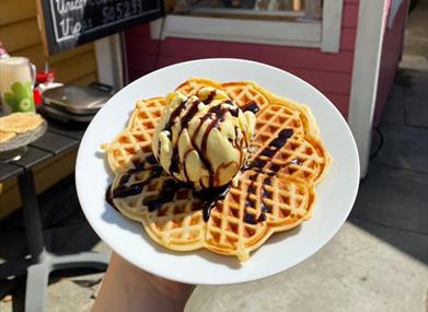Krambua huser en koselig liten kafe, isbar og museumsbutikk. Krambua er fra 1828 og en del av Flekkefjord museum.