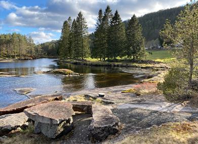 Gapahuk med bålplass, steinborg ved elva.