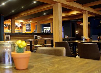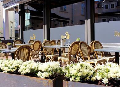 Fru Juske har en stor og solrik uteservering med varmelamper og alle rettigheter for lange kvelder med live musikk, arrangementer og kos.