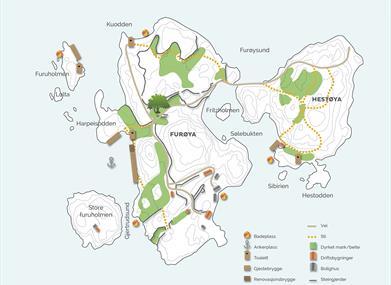 Furøya har mange båt- og teltplasser rundt hele øya. Her kan du også leie et hyggelig sommerhus – midt mellom vakre, gamle bygninger.