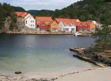 Feriehusene har ulik størrelse og form, og de fleste har panoramautsikt utover sjøen og skjærgården, og fra alle er det kort vei til brygger, badebukt og sandstrand.