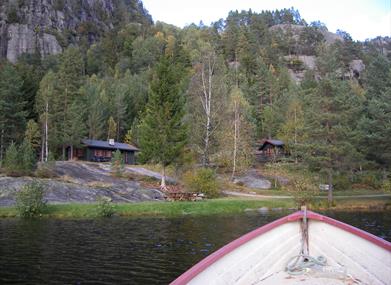 Hyttene ligger for seg selv i kanten av et vann.