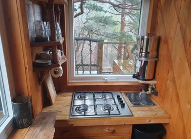 Det er et lite kjøkken med kokemuligheter, vask med vanntilførsel fra en regnvannsoppsamlingstank, og det du trenger av bestikk, glass og tallerkener. Alt du trenger å ta med er sengetøy og mat.
