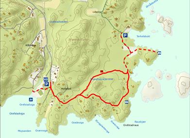 Dette er en lettgått og kort tur som også er fin å ta som en avveksling til sol og bad i Grefstadvika sommerstid. Turen går på grus og sti, men har noen ulendte partier. Rundturen er derfor ikke anbefalt for barnevogn eller rullestol. Sykler kan leies over disse partiene.