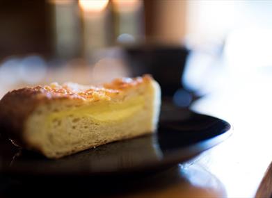 Alle dager vi har åpent serverer vi hjemmebakt kringle og rundstykker, kaffe, te, sjokoladedrikk, mineralvann og is. Vi har også glutenfrie rundstykker på bestilling, suppe med brød. Alt er hjemmelagd og kortreist mat.