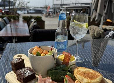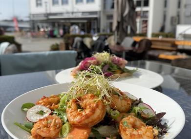 Restauranten har uteservering ut mot Hestetroa (gågaten) og mot Giert Karis Plass (elva).