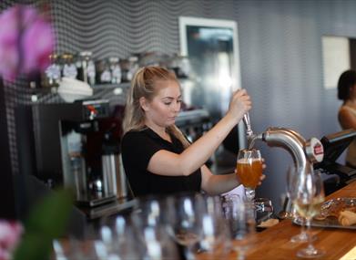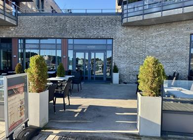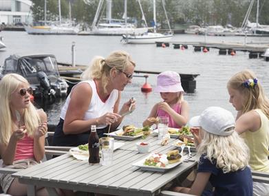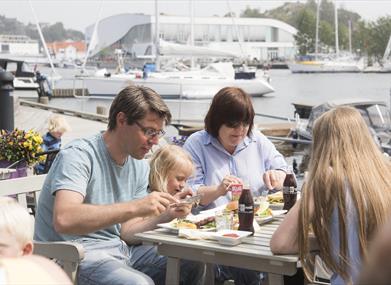 Uteservering på bryggen, avslappet og hyggelig stemning. I løpet av året arrangeres det konserter, kurs, filosofikvelder m.m.