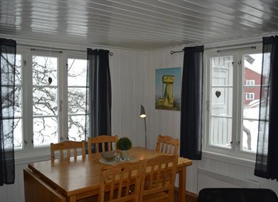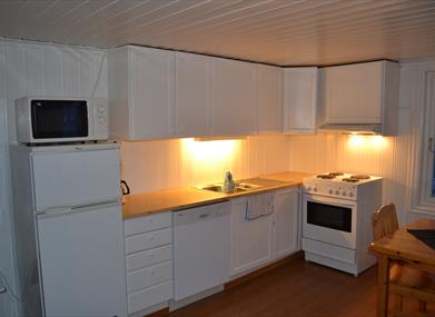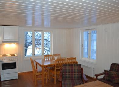Leiligheten har plass til 8 personer. Det er kombinert kjøkken og stue. Kjøkkenet er godt opprustet med barnestol, kaffetrakter, tekoker, oppvaskmaskin. Det er tv i stua, og parabol. Det er 4G internett på Knaben. Leiligheten blir varmet med elektrisitet.