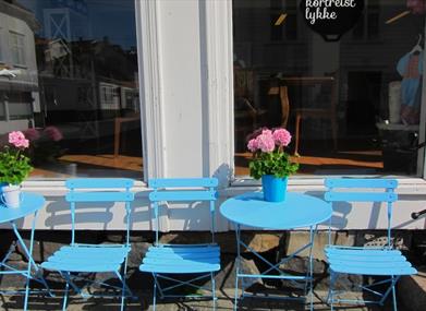 Hyggelige sitteplasser ute hvor man kan nyte hjemmebaksten, kaffe og is.