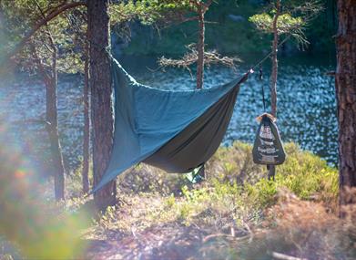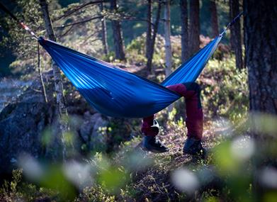 Når kvelden kommer, er «sengen» redd opp: kvalitetshengekøyer fra Hennesey Hammock, med myggnett og tak/tarp for en mest mulig behagelig nattesøvn. Hengekøyene kan enkelt hektes fast i ferdig oppsatte stropper. Du trenger bare ta med din egen sovepose.