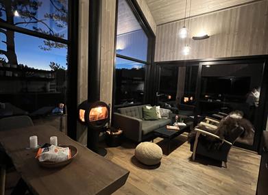 Hytta er tegnet og prosjektert av anerkjente Arkicon, og selve gulvflaten starter seks meter over bakken. Verandaen utenfor hytta er utstyrt med gode utemøbler og en bålpanne, og den henger nærmest utover en skrent som gjør opplevelsen enda mer spektakulær.