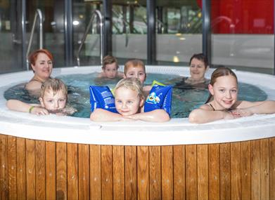 I svømmehallen finner du også et lite plaskebasseng for de aller minste, samt et boblebad innendørs, et boblebad utendørs (inne) og badstue med isvannsbøtte og dusj like ved. Garderobene er universelt tilpasset.