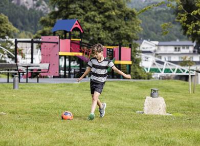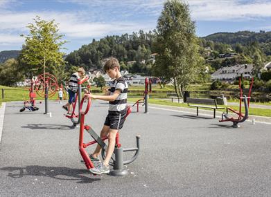 Kvinaparken har trimapparater, sykkelløype og lekepark for de minste.