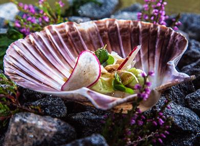 På Havhotellet nyter de å bo midt i matfatet, og menyen på hotellet tar utgangspunkt i lokale smaker, råvarer og historier. Ingen andre steder er det større mangfold i den grønne og blå naturen enn nettopp der Havhotellet ligger. Området rundt har en rik matkultur og historie som kokker og servitører lærer av og inspireres av. Og Kjøkkensjef Bernt Sætre og hans team elsker å utforske de mulighetene som ligger i råvarene vi finner rett utenfor kjøkkendøren.