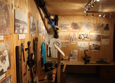 Utvandrere på arbeid. Hva var de mest vanlige arbeidsområdene for utvandreren? Her blir det i tillegg til skriftlig informasjon brukt fotografier som viser farmarbeid, snekring, golvlegging, fiske og gullgraving. Verktøy, arbeidsklær og andre gjenstander stilles også ut.