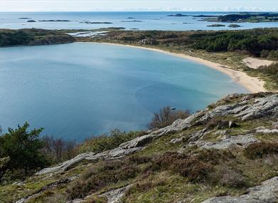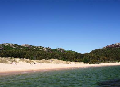 Her er det også ei brygge man kan legge til med båt, og stranden er lett tilgjengelig med bil.