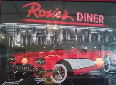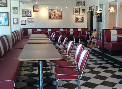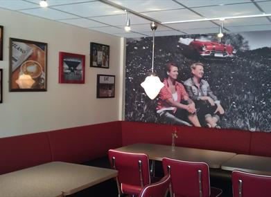 Hjemmelaget mat i hyggelige omgivelser i amerikansk ”diner stil”. Stort aktivitetsrom for barna, med bl.a. sklie og ballrom. I 2. Etg.