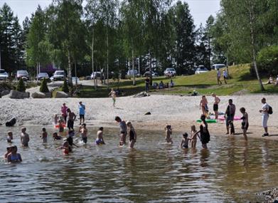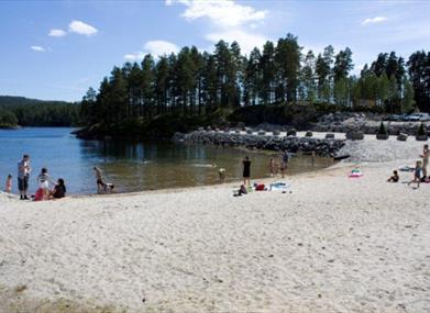 I Paradisbukta ved Mineralparken i Evje er det en flott sandstrand. På varme sommerdager er det perfekt å kjøle seg ned med et bad etter besøk på Mineralparken opplevelsespark og aktiviteter i klatreparken Klatreskogen.