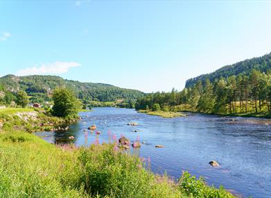Like ved Rafossen er det et stort svaberg som er ypperlig til piknik og fisking.
