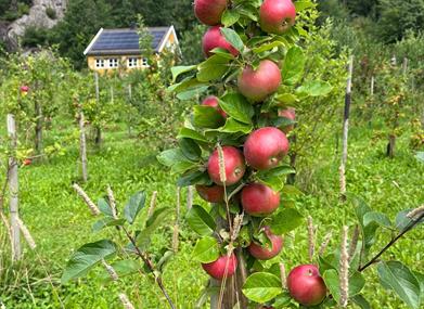 Med et jordbruksareal på 25 dekar dyrker vi et mangfold av frukt og bær, inkludert epler, plommer, rips, solbær og flere andre bærsorter.