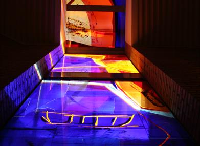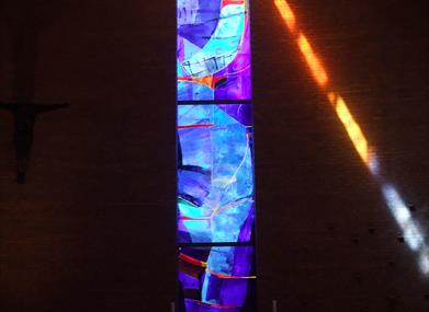 Glassmaleriet har en totalt lengde på 43 meter og en bredde på 1,80 meter. Dette er laget av kunstneren Kjell Nupen.