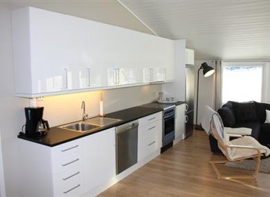 Leiligheten har en åpen og innbydende kjøkkenløsning, som både er praktisk og hyggelig når du tilbereder måltidene.