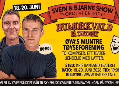 Svein & Bjarne inviterer til en humorkveld full av sprelske historier, absurde påfunn og ekte sørlandshumor. En forestilling om vennskap, «ekteskap» og alt det komiske som skjer i hverdagen – du vil garantert kjenne deg igjen og le deg skakk!