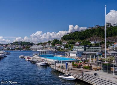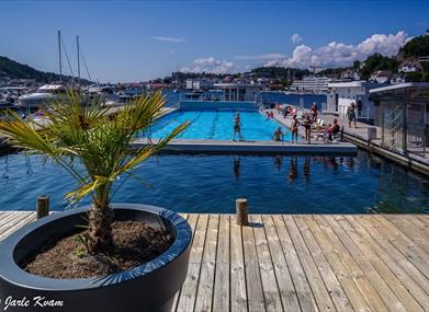 Her kan du ta en forfriskende svømmeøkt på havnivå med vakre Tyholmen som bakteppe. Temperaturen i bassenget skal ligge rundt 27 grader.