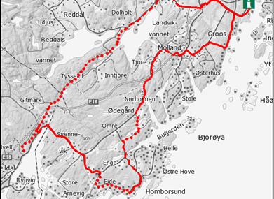 Start fra turistkontoret, sykle sørvestover langs bryggene forbi Oddensenteret og videre på Bark Silas vei frem til rundkjøringen. Fortsett på fv. 420. Etter ca. 1,6 km krysser du E 18 i undergang og følger sykkelveien oppover til venstre. Følg veien langs E 18 til Bergemoen. Ta til venstre på Bergemoveien og følg skilting til Landvik kirke. Ved Landvik kirke tar du til venstre. Etter 2 km følger du skiltet med Vestlandske hovedvei. Denne gamle veien er delvis svært kupert og krevende å sykle på, men ligger idyllisk til. Etter ca. 4 km kommer du til Tyssekil, flott sted for en rast. Fortsett videre på Vestlandske hovedvei frem til Kaldvell, som er et nydelig naturområde med mulighet for å fiske. Fra Kaldvell er det tryggest å sykle et stykke tilbake på Vestlandske hovedvei. Etter ca. 1,3 km møter du en asfaltert vei. Ta til høyre og så til venstre for å følge fv. 420 tilbake mot Grimstad. Etter 500 m kommer du til Svennevig friområde med WC og gode bademuligheter. Fra Svennevig bro er det gang- og sykkelvei videre. Ved Lindtveit følger du skilting mot Eide. Ta til høyre ved Eide kirke, og fortsett på KNA-veien. Følg denne grusveien forbi Breivik camping i 2,5 km til den møter Kistevigveien. Ta til venstre og fortsett rett frem, når du kommer på Homborsundveien. Etter 300 m kan du ta til høyre for en avstikker ned til Kalvehageneset som er et flott turområde (skiltet med Kjekstad og så med Kalvehageneset). Ellers fortsetter du bare rett frem på Homborsundveien. Etter broa over Bufjorden, tar du første grusvei til høyre. Følg Vågsholt rett frem og sving skarpt til venstre, når du ser det andre vannet. Etter 850 m havner du på fv. 420 og tar til høyre. Du kommer forbi den gamle herregården Nørholm – Knut Hamsuns bosted fra 1918-1952. Følg skilting til Nasjonal sykkelrute nr. 1 tilbake til Grimstad.