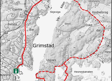 Start fra turistkontoret og følg Smith Petersens gate mot Arendal forbi Grimstad kirke og Grimstad rådhus. Fortsett rett frem på gang- og sykkelveien over Biesletta. Kryss over veien ved innkjøringa til Bieheia og følg deretter gang- og sykkelveien på høyre side av fv. 420. I Vikkilen tar du til høyre og følger skilting til Rønnes. Etter 2 km kommer du forbi Grimstad golfklubb. Fortsett rett frem og passer Drottningborg. Så kommer du forbi Hesnes gartneri, hvor du kan kjøpe forfriskninger, grønnsaker eller ferskt bakverk. Følg den asfalterte veien helt til Rønnes og nyt den fine utsikten over til byen. Følg veien videre. Etter noen hundre meter krysser du over sjøen på en smal trebro og kommer inn på området ved Marivold camping. Her passer det kanskje både med en rast og et bad. Følg veien gjennom campingen, videre gjennom skogen til du støter på Hesnesveien igjen. Ta til høyre og følg veien tilbake til byen.