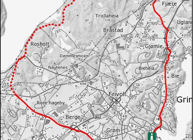 Start fra turistkontoret, sykle sørvestover langs bryggene forbi Oddensenteret og videre på Bark Silas vei frem til rundkjøringen. Fortsett på fv. 420. Etter ca. 1,6 km krysser du E 18 i undergang og holder rett frem. I rundkjøringen på Bergemoen fortsetter du rett frem og følger skilting mot fv. 404 Bakken. I veikryss med skilting mot Kryssen krysser du hovedveien og fortsetter på den lille grusveien til venstre. Etter 650 m havner du på gang- og sykkelveien ved Rorevann. Hold rett frem noen meter og kryss deretter veien. Følg skilting mot Rosholt. Du er nå på den gamle jernbanetraséen for Grimstad-Frolandsbanen (nedlagt 1961), og du sykler langs Rorevannet som er drikkevannskilde for Grimstad og Arendal. Etter ca. 2 km svinger grusveien til høyre, vekk fra vannet. Når du møter asfaltert vei ved kraftstasjonen, ta til høyre mot Fjære kirke. Det er verdt å ta et stopp ved Fjære kirke (bygget ca. 1150). Følg skilting mot Bie over krysset og ned bakken. Etter 750 m krysser du E 18 i undergang. Ta til høyre og etter noen få hundre meter til høyre igjen. Følg fv. 420 tilbake til sentrum.