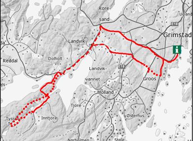 Start fra turistkontoret, sykle sørvestover langs bryggene forbi Oddensenteret og videre på Bark Silas vei frem til rundkjøringen. Fortsett på fv. 420 i ca. 500 m. Ta til venstre, og følg skilt til Groos. Veien krysser en liten bekk etter 800 m. Der tar du til høyre inn på en liten grusvei og følger den oppover langs bekken. Du kommer forbi et tjern. Følg bekken videre oppover helt til Terje Løvås vei. Kryss Terje Løvås vei og fortsett forbi Løvåsvollen gård med den store, gule låven og følg gang- og sykkelstien videre. Ved Bergemoen passerer du E 18 i overgang og følger skilting til Landvik kirke. Ta til venstre ved Landvik og følg skilting til Nasjonal sykkelrute nr. 1. Etter 2 km ser du starten på Vestlandske hovedvei. Følg denne skogsveien. Etter 1,5 km kommer du til et kryss med asfaltert vei – ta til venstre. Følg asfaltert vei videre, du får nå vannet på høyre side. Der asfaltveien slutter, ta til høyre forbi bommen og følg grusveien. Ved Tyssekil (etter totalt 12 km) møter du igjen Vestlandske hovedvei. Det er en idyllisk plass – et fint sted for en rast. Ta til høyre langs Vestlandske hovedvei. Tilbake i krysset, ta av Vestlandske hovedvei og følg asfaltert vei til venstre. Når du treffer en ny vei, hold til høyre. Følg veien forbi Landvik kirke mot Roresanden. Når du kommer på toppen av bakken, ta første til høyre. Følg Gjærbrøndveien og så Vesterled (fv. 420) tilbake til turistkontoret.