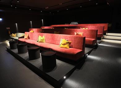 - Intimscenen – Stemningsfull salong med røde sofaer og plass til 67–90 gjester. Ideell for mindre konserter, bokbad og foredrag.