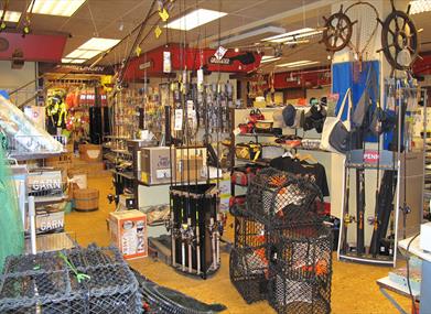 Her har de smått og stort av kroker, vadere, garn, bøyer, fiskestenger, fiskesnører m.m.