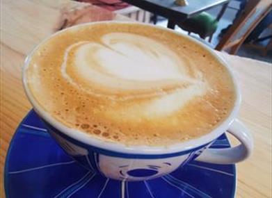 Kaféen holder til i gårdens gamle skolehus fra 1900 og er åpen søndager fra påske, kl. 13.00–18.00. Her kan du komme tett på dyrene når de er på beite, og kjøpe produkter direkte fra gården. På søndager serverer vi middag og småretter, samt dessert og kaker. Maten er i stor grad basert på gårdens egen produksjon og andre lokale råvarer. Kaffen fortjener også en ekstra omtale – mange av våre gjester har sagt at det er den beste kaffen de har smakt.