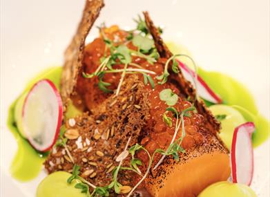 Menyen er sesongbasert med fokus på kvalitet i alle ledd og smaker som forteller om restaurantens lokasjon ved kysten.