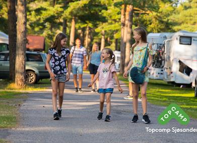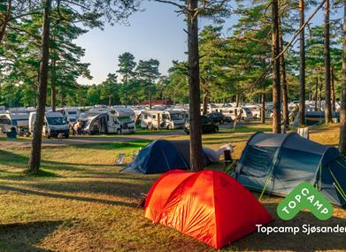 Camping: Campingområdet vårt er idyllisk plassert mellom skogsområdet Furulunden og den berømte stranda Sjøsanden. Vi har campingplasser med asfalt og gress - begge med strøm. I skogområdet like ved stranda ligger de hyggelige teltplassene våre.