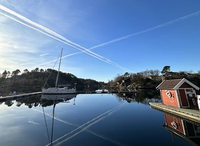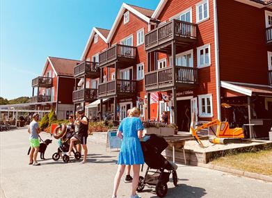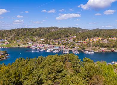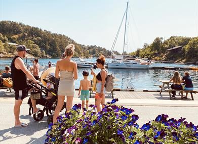 ved bryggekanten.Her finner du butikk med ferske bakevarer, restaurant med konserter, basseng om sommeren og aktiviteter som båtleie, kajakk og fisketurer. Det er også overnatting i hytter og leiligheter med sjøutsikt.